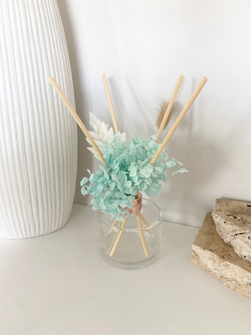 Our reed diffuser features hand-arranged dried flowers, crafted to order for a unique, natural touch. It delivers a long-lasting fragrance, enhancing your space with a unique, botanical charm.